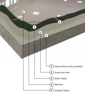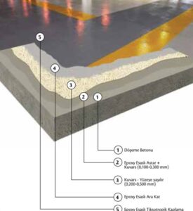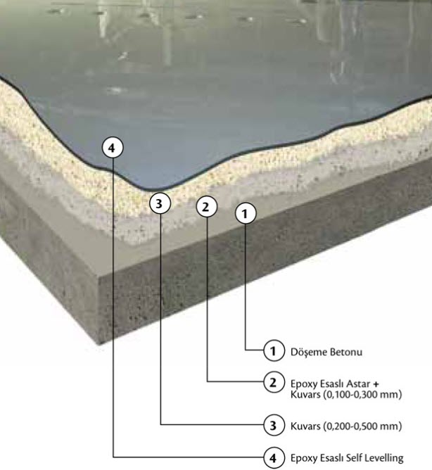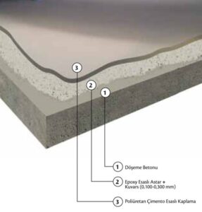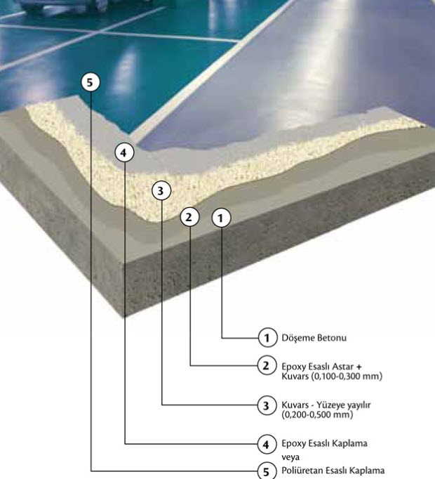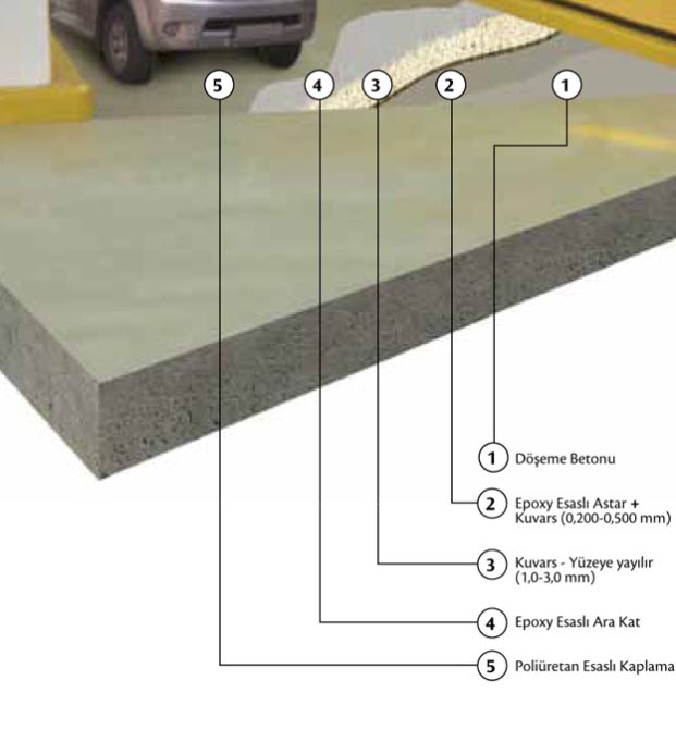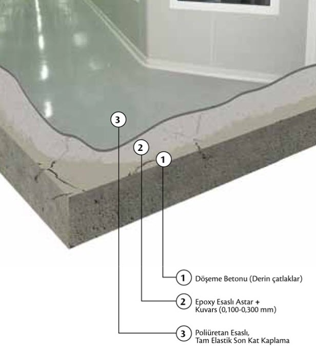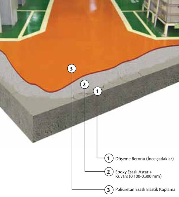 Yekpare olarak uygulanan benzer kaplama sistemlerinde, yapılan self leveling kaplamayı koruyan her hangi bir uygulama yoktur. Bu sebeple yapısı itibariyle basınç mukavemeti yüksek olmasına karşın mekanik olarak dirençli olmayan kaplama malzemesi kısa sürede çizilir ve istenmeyen çirkin bir görüntü oluşur. Poliüretan sistemlerde ise bunu engelleyen yoğun insan ve araç trafiğine karşı dayanıklı, yüksek sürtünme direncine sahip bir son kat boya kullanılır.